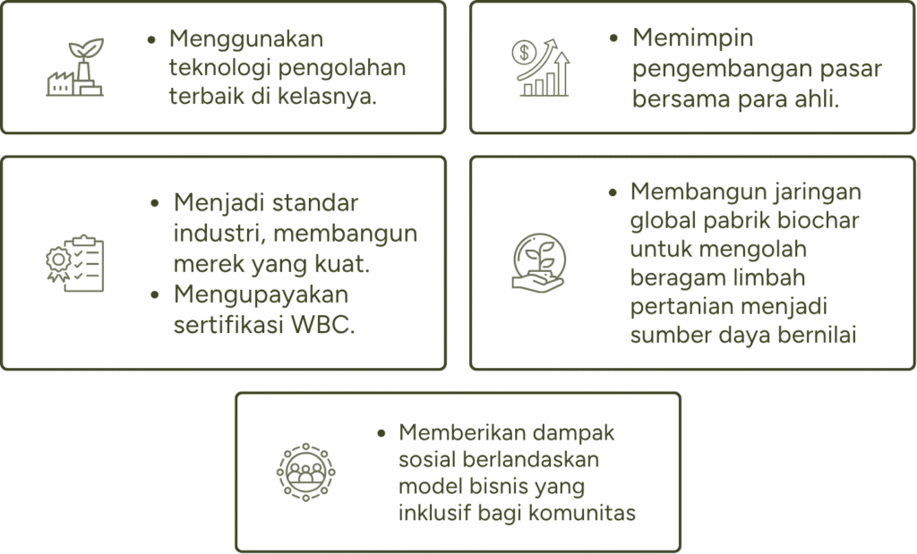 Pada tahun 2030, kami menargetkan untuk menjadi produsen biochar berskala global yang mampu mengolah lebih dari setengah juta ton limbah pertanian setiap tahun, mendorong pertanian regeneratif serta mengubah tantangan limbah yang besar menjadi dampak berkelanjutan bagi iklim dan komunitas.